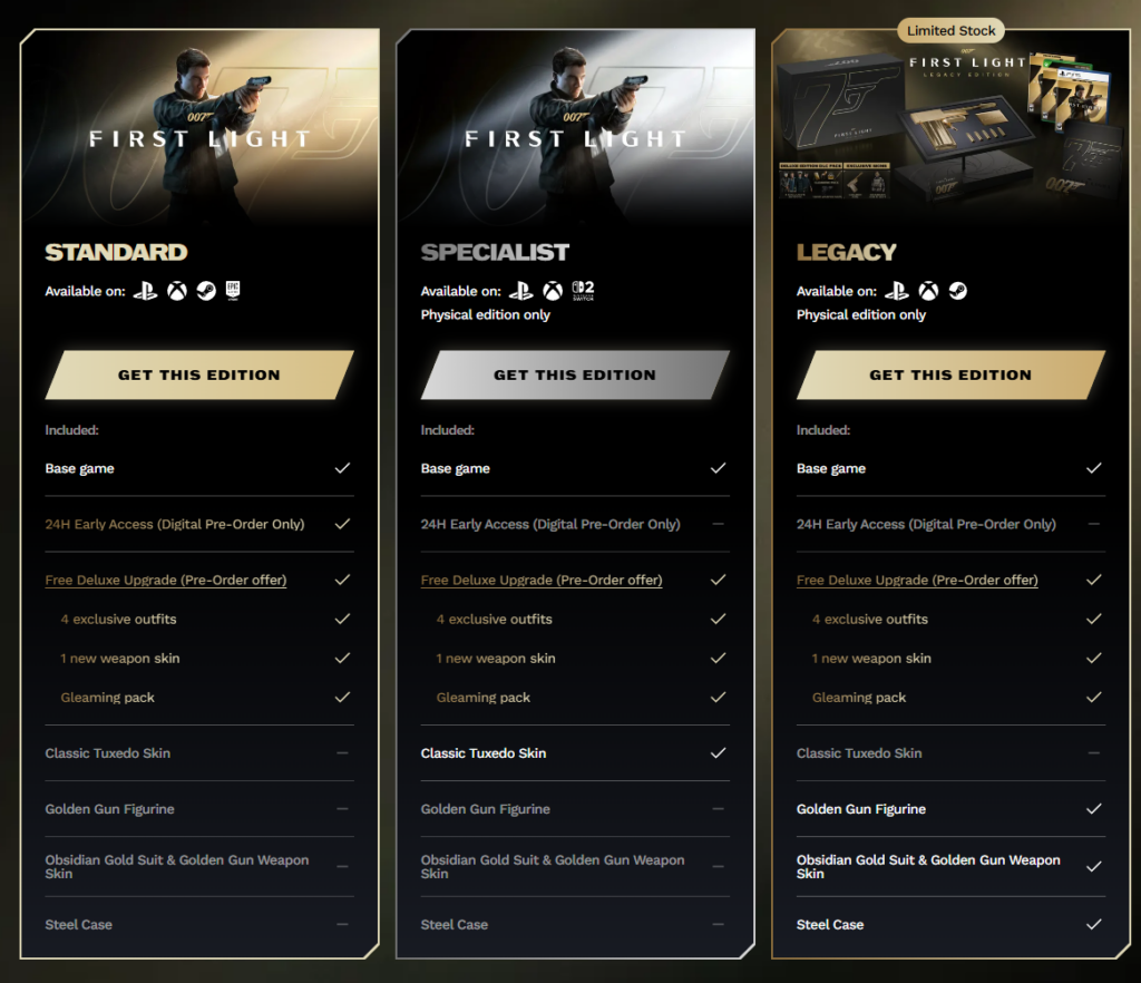 De Legacy Edition is een exclusieve uitvoering met een prijskaartje van net geen 300 euro. Deze editie bevat al het bovenstaande* én een fysieke replica van de Golden Gun, in-game Golden Gun, in-game Obsidian Gold Suit en een steelbook-omslag.