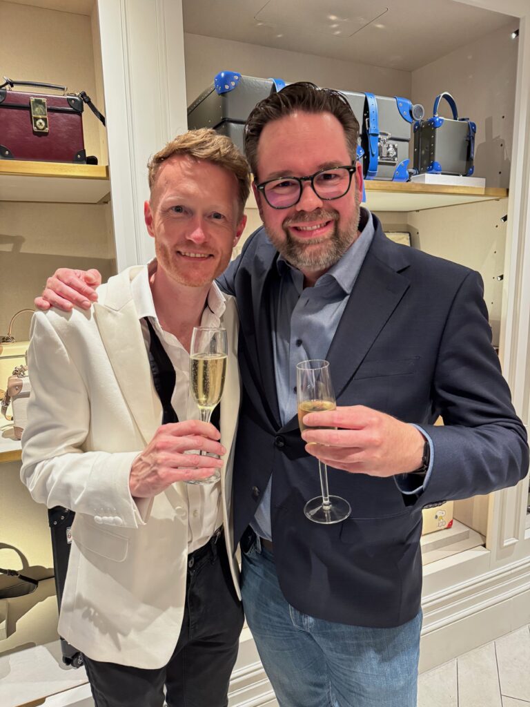 Tijdens het evenement bij Grey Flannel kwam ik een oude maat tegen. Hij nodigde me uit voor een evenement bij Globe-Trotter. Deze koffer maker is al bijna 130 jaar een begrip in de reiswereld en is sinds de release van Skyfall (2012) bij de James Bond-franchise betrokken. Bij aankomst stond Philip Dewhurst, de man die me had uitgenodigd, al op me te wachten. Hij had er in de middag al elf mijl (ongeveer 17,7 kilometer) te voet als voorzitter van 007GB op zitten. Dat alles ten voordele van Unicef.