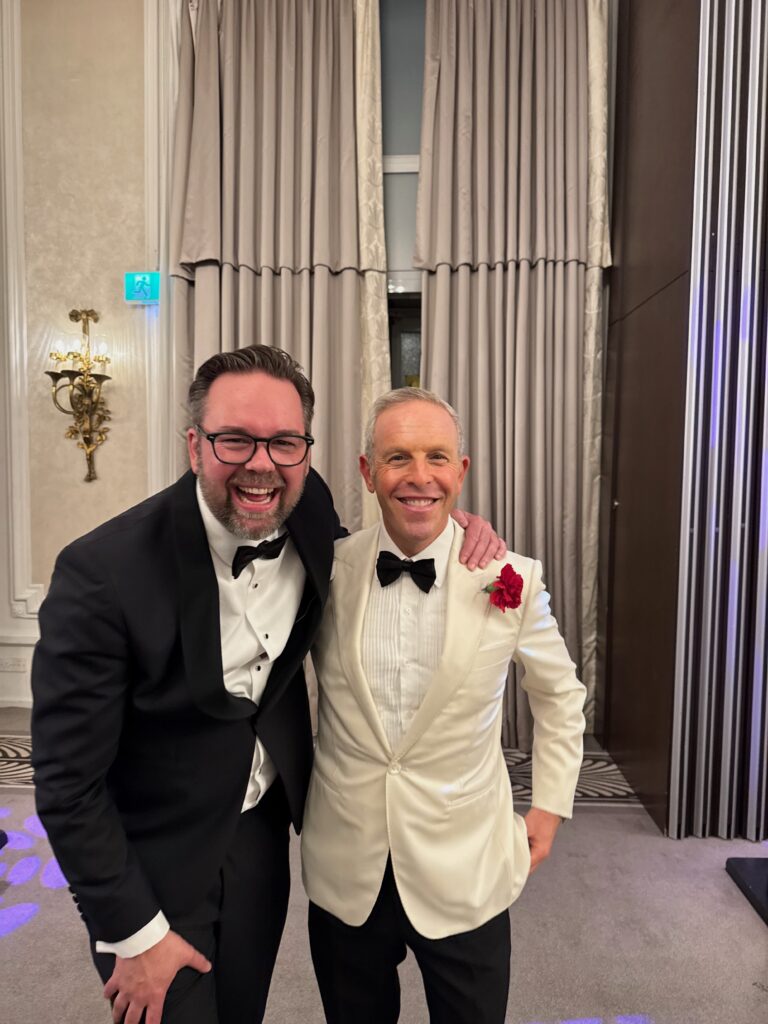 We begonnen deze middag met de pre show in het Waldorf Hilton-hotel. Zoals je misschien al verwacht kwamen we al onze vrienden weer tegen en maakten we nieuwe. Iedereen zag er prachtig uit. De heren in smoking of mooi tweedelig pak en de dames in lange galajurken. Het zandkleurige pak van Jeroen was prachtig gekozen. Ik voelde me in mijn nieuwe smoking als een vis in het water. Alleen mijn lakschoenen waren sinds de ochtend dat ik ze aantrok een probleem. Je kent het vast wel: het klassieke voorbeeld van je schoenen niet inlopen. Daarover later meer.
