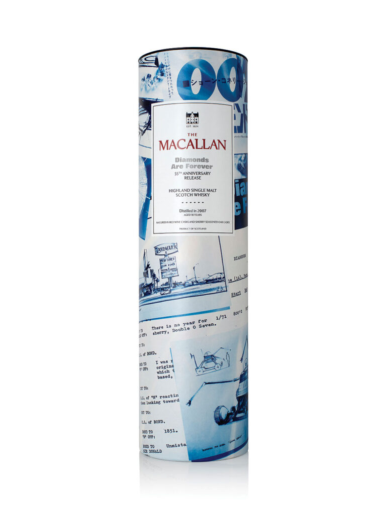 De gelimiteerde Diamonds Are Forever (1971) release, gedistilleerd in “2-007” en achttien jaar later gebotteld, zoekt nadrukkelijk de verbinding met filmgeschiedenis. Het is een whisky die meer wil zijn dan alleen drank: het is een object met een verhaal, een samensmelting van stijl, vakmanschap en culturele iconen.